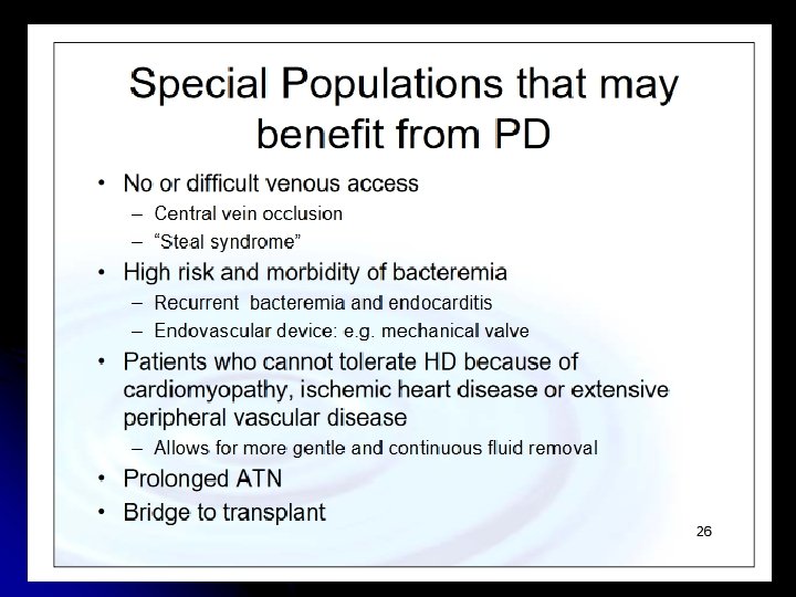 Indikasi Renal l Uremia / azotemia l uraemic encephalopathy l uraemic pericarditis l uraemic haemorrhage l Pertimbangkan bila urea >30 -35 m. M (180 -210 mg/d. L) no strict cut-off. l Fluid overload l oliguria volume overload signifikan secara klinis dan respiratory distress Tidak teratasi dengan pengobatan.