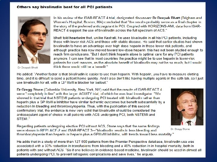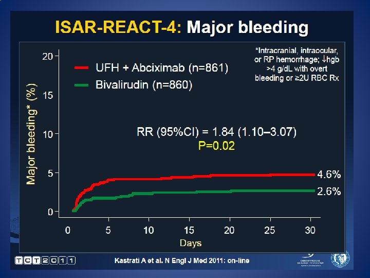 ISAR REACT 3 • Bivalirudina X HNF durante ATC estável ou instável sem elevação de marcadores • N Engl J Med 2008; 359: 688 -96 • Conclusão: Bivalirudina não é superior a HNF nos desfechos compostos (Morte/IAM/Recasc urgência e sangramento maior). » Bivalirudina reduz significativamente a incidência de sangramento maior