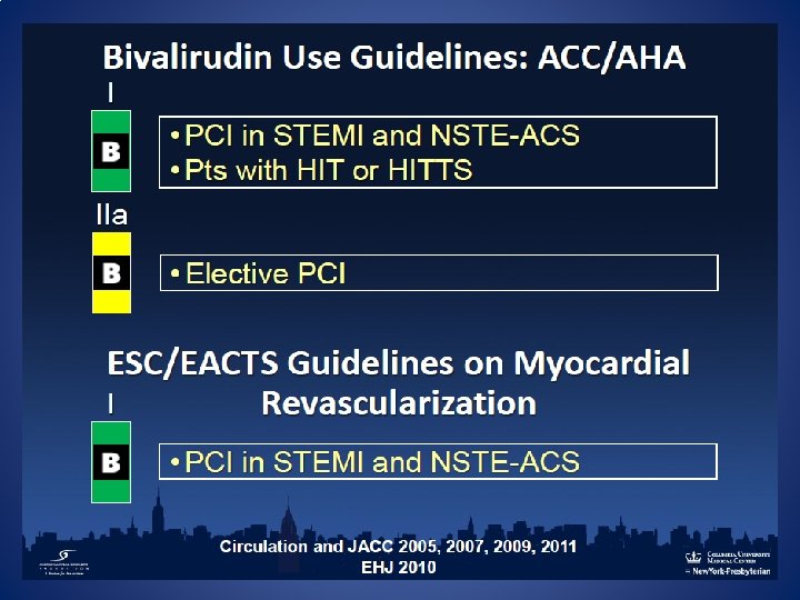 TERAPIA ANTICOAGULANTE • ABORDAGEM INTERVENCIONISTA MEDIDAS DE SALA : • 1) HNF 70 -100 UI/kg – TTPa>250 seg • 2) Enoxaparina 0. 5 or 0. 75 mg/kg i. v. bolus • 3) Bivalirudina 0. 1 mg/kg i. v. bolus mais 0. 25 mg/kg/h durante ATC • IGP IIb. IIIa ?