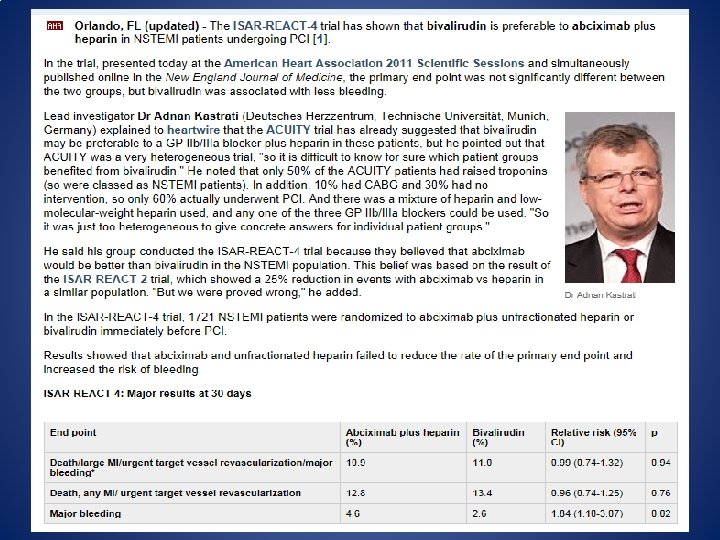 ISAR REACT • (Intracoronary Stenting and Antithrombotic Regimen–Rapid Early Action for Coronary Treatment) • Investigador principal Dr. Adnan Kastrati (Deutsches Herzzentrum, Technische Universität, Munique, Alemanha)