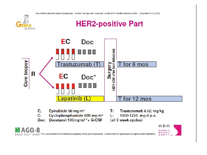 CHER LOB Trial: study plan C O R E B I O P S Y R A N D O M I Z A T I O N A B Lapatinib 1500 mg/daily C S U R G E R Y Chemotherapy 5 FU 600 mg/m 2 Epi 75 mg/m 2 CTX 600 mg/m 2 TXL 80 mg/m 2 Trastuzumab 2 mg/kg Lapatinib 1000 mg/daily Guarneri V, ASCO 2011