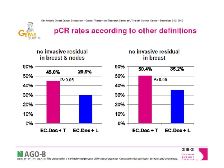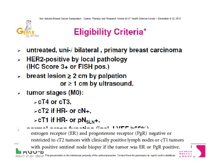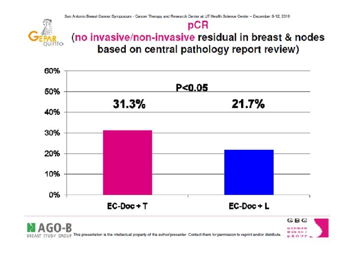 HORMONE RECEPTOR STATUS AND p. CR % p. CR Trial/author pts # Regimen HR + % HR- HR+ Kemeny 54 FACVb 66 20. 0 7. 7 Ring 435 CMF, A/E 71 21. 6 8. 1 Bear 1211 AC 59 13. 6 5. 7 Bear 565 AC+T 57 22. 8 14. 1 GEPARDO 250 dd. AD+/-T 56 15. 4 1. 1 GEPARDUO 913 dd. AD/CA-D 74 22. 8 6. 2 GEPARTRIO 286 TAC/TAC-NX 68 36. 6 10. 1 Guarneri 1731 FAC+/-P 68 23. 8 7. 8 Gianni 438 A+/P/CMF 63 42. 2 11. 6 Guarneri 201 FEC/ET/GET 74 16. 6 3. 5 Colleoni 399 ECF/EC/ET/Vi. Fu P 68 33. 3 7. 6