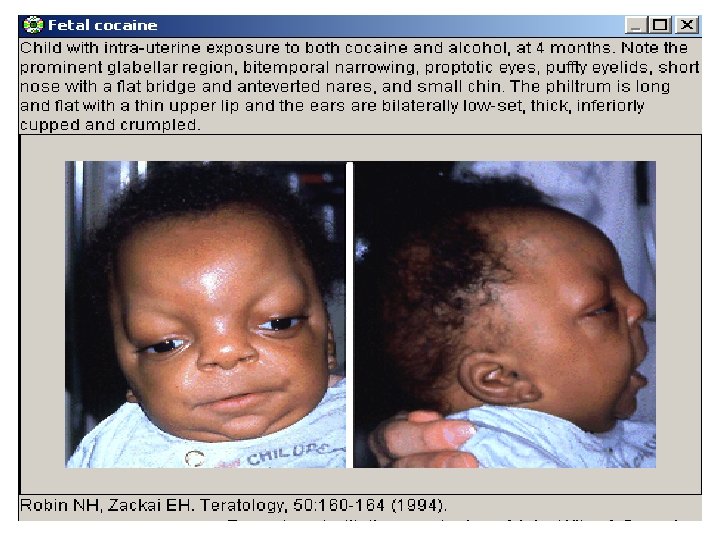 Cocaine • • Microcephaly Prematurity Low birth weight. Abruptio placentae (separation of placenta from uterus wall before delivery) Growth retardation Mental retardation Withdrawal symptoms
