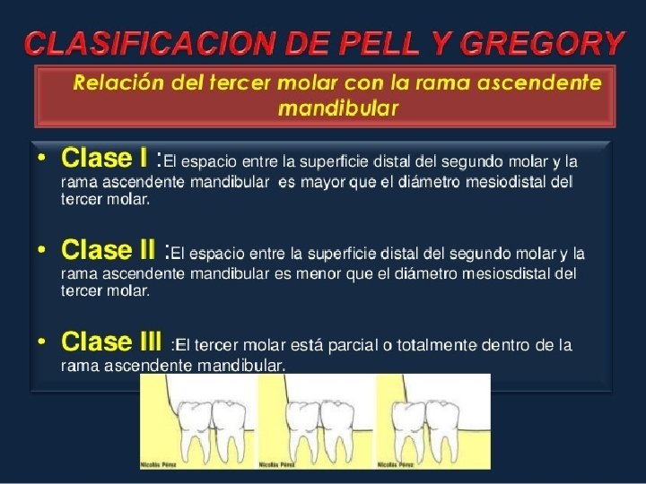 CLASIFICACIÓN Para el estudio de las posibles localizaciones de los cordales incluidos, usaremos la clasificación de PELL Y GREGORY. Esta clasificación se basa en una evaluación de las relaciones del cordal con el segundo molar y con la rama ascendente de la mandíbula y con la profundidad relativa del tercer molar en el hueso.