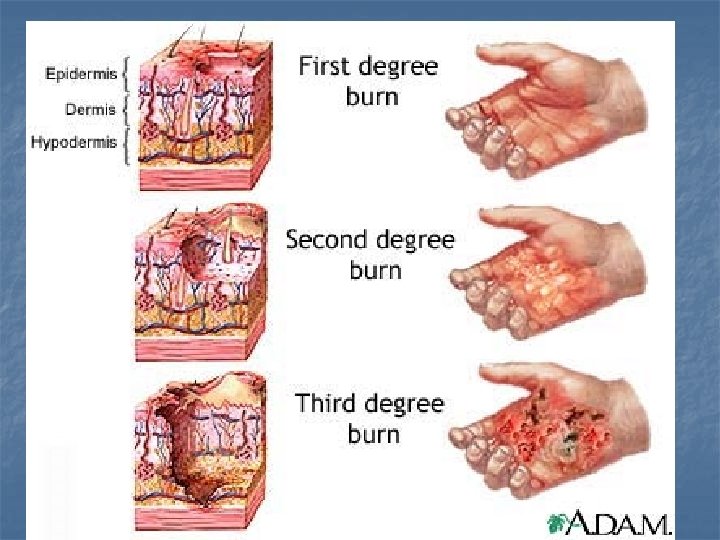 LOKÁLNÍ - POPÁLENINY n n n Celková závažnost poškození závisí na rozsahu a hloubce, věku, umístění a příčině Určení rozsahu poškození – pravidlo devíti (poškození více jak 15% vyvolává šok) Určení hloubky poškození: 1. stupeň – epidermální: zčervenání 2. stupeň – dermální: puchýře 3. stupeň – subdermální: odumření tkáně