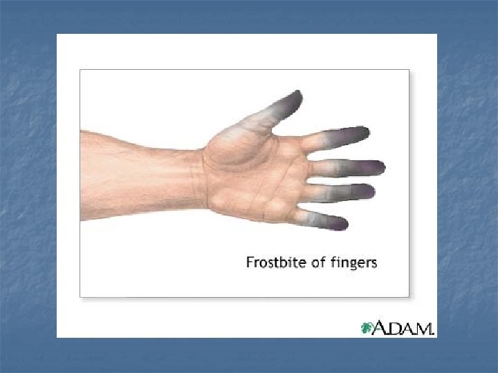 OMRZLINY n n Vznikají účinkem chladu, obvykle na krajních částech těla (prsty, nos, uši, tváře) Určení hloubky poškození: 1. stupeň: bledá, nafialovělá, málo citlivá kůže 2. stupeň: necitlivá, nažloutlá kůže s puchýři 3. stupeň: nenávratná odúmrť tkáně (amputuje se); zamrzlé části jsou křehké, po zamrznutí se rozpadají