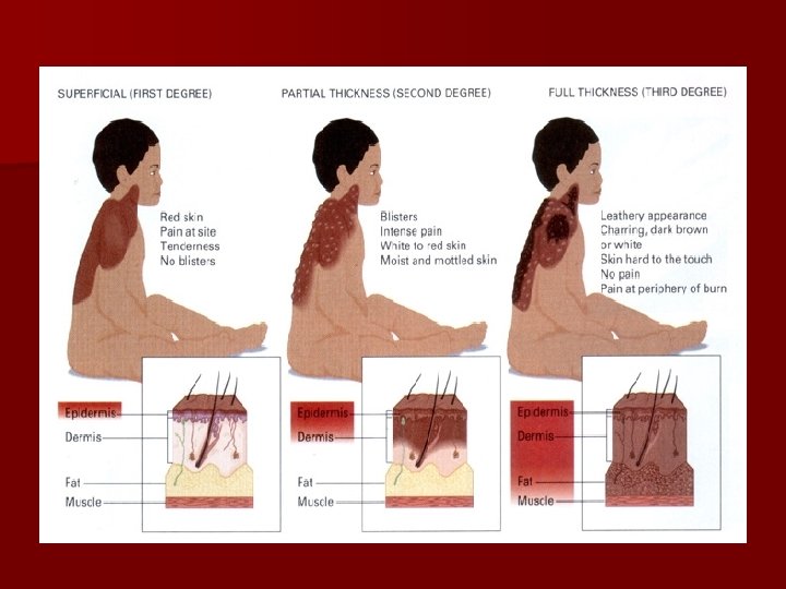 Podela opekotina Prema dubini zahvaćenih tkiva: n površinske – I stepen (bol, crvenilo, otok) – II stepen (pojava plikova – bula) n duboke – III stepen (opsežne rane) – IV stepen – ugljenisano tkivo