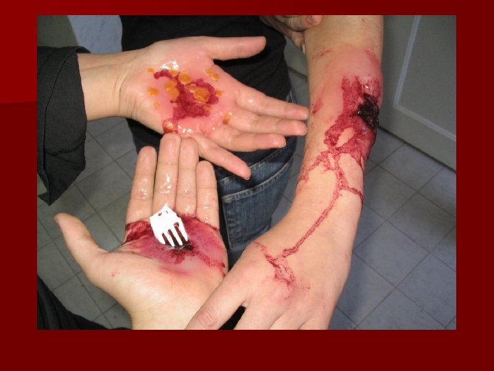 Procena malih opekotina n “Pravilo dlana” je praktičnije za manje opekotine n računa se kao 1% telesne površine povređene osobe (uzima se dlan povređene osobe!)