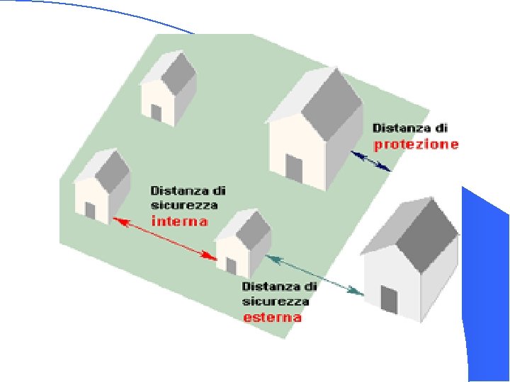 2. - Distanze. 2. 1. Distanza di sicurezza esterna. Valore minimo stabilito dalla norma, delle distanze orizzontalmente tra il perimetro in pianta di ciascun elemento pericoloso di una attività e il perimetro del più vicino fabbricato esterno alla attività stessa o di altre opere pubbliche o private oppure rispetto ai confini di aree edificabili verso le quali tali distanze devono essere osservate. 2. 2. Distanza di sicurezza interna. Valore minimo, stabilito dalla norma, delle distanze orizzontalmente tra i rispettivi perimetri in pianta dei vari elementi pericolosi di una attività. 2. 3. Distanza di protezione. Valore minimo, stabilito dalla norma, delle distanze misurate orizzontalmente tra il perimetro in pianta di ciascun elemento pericoloso di una attività e la recinzione (ove prescritta) ovvero il confine dell'area su cui sorge attività stessa.