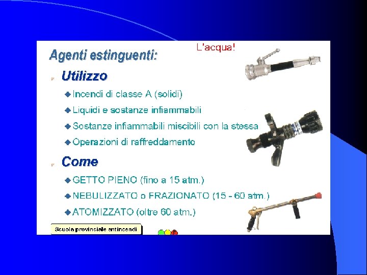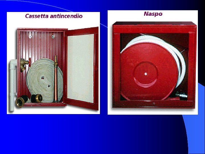 4. 7. Impianto fisso di estinzione. Insieme di sistemi di alimentazione, di valvole, di condutture e di erogatori per proiettare o scaricare un idoneo agente estinguente su una zona d'incendio. La sua attivazione ed il suo funzionamento possono essere automatici o manuali. 4. 8. Lancia erogatrice. Dispositivo provvisto di un bocchello di sezione opportuna e di un attacco unificato. Può essere anche dotata di una valvola che permette un getto pieno, il getto frazionato e la chiusura. 4. 9. Naspo. Attrezzatura antincendio costituita da una bobina mobile su cui è avvolta una tubazione semirigida collegata da una estremità, in modo permanente, con una rete di alimentazione idrica in pressione e terminante all'altra estremità con una lancia erogatrice munita di valvola regolatrice di chiusura del getto.
