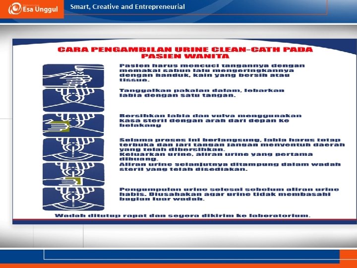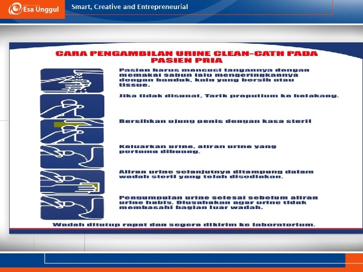 Persiapan Pasien • Sebisa mungkin pasien tidak mengkonsumsi obat-obatan dalam 72 jam terakhir. (contoh : jenis obat diuretik dapat menyebabkan pengenceran urine, vitamin C berpengaruh terhadap pemeriksaan kimia urine) • Formulir permintaan pemeriksaan laboratorium dari dokter pengirim : identitas pasien, jenis pemeriksaan, diagnosa.