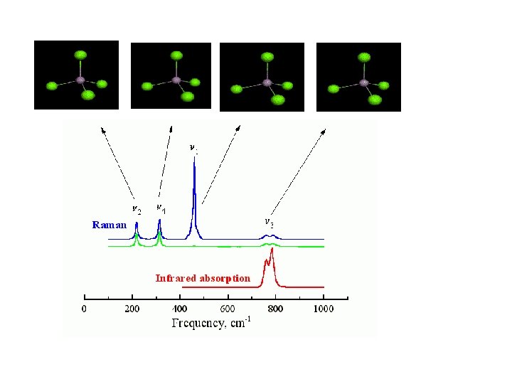 v 1 = 460 cm-1 (vibração simétrica) v 2 = 214 cm-1 (duplamente degenerada) v 3 = 780 cm-1 v 4 = 313 cm-1 (triplamente degeneradas) Vamos ver este modos em esp. Raman e IR
