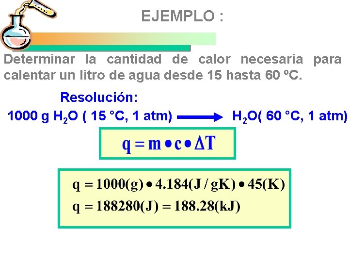 EJEMPLO : Determinar la cantidad de calor necesaria para calentar un litro de agua desde 15 hasta 60 ºC. Resolución: 1000 g H 2 O ( 15 °C, 1 atm) H 2 O( 60 °C, 1 atm)