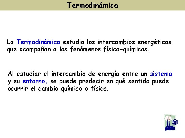 Termodinámica La Termodinámica estudia los intercambios energéticos que acompañan a los fenómenos físico-químicos. Al estudiar el intercambio de energía entre un sistema y su entorno, se puede predecir en qué sentido puede ocurrir el cambio químico o físico.