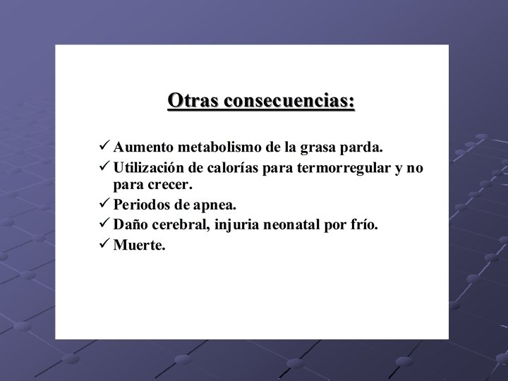 Factores de vulnerabilidad del neonato al estrés térmico (RNPT/BP) Producción de calor: Entre las 28 -30 s EG comienza la respuesta al frío, capaz de aumentar tasa metabólica. Depósito limitado de glucosa, grasa, glicógeno. Termogénesis Química ( grasa parda). Obliga al consumo de O 2 desafiando sistemas cardiovascular y pulmonar inmaduros. Alta relación superficie/volumen Pérdidas por evaporación. Respuesta muscular involuntaria no desarrollada.