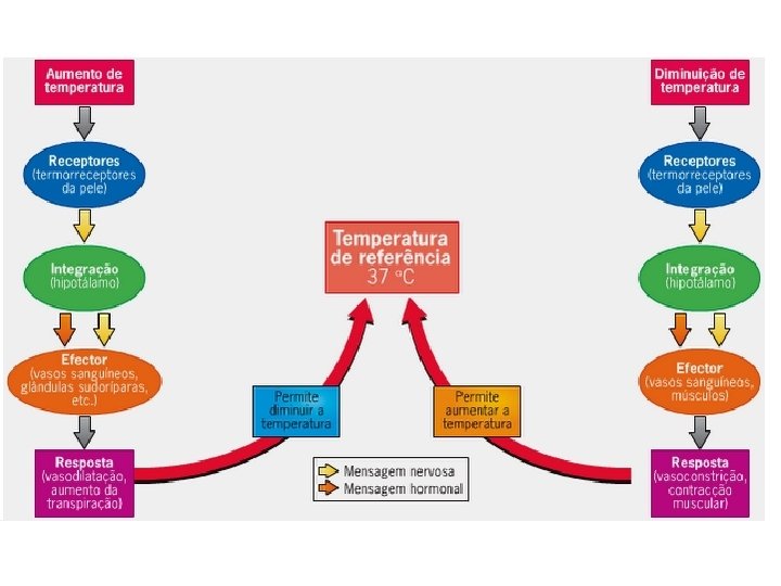 Equilíbrio térmico Ponto de ajuste 37°C Hipotálamo Receptores térmicos redução da temperatura Arteríolas da pele Glândulas sudoríparas Musculatura vasoconstricção Tremor Ganho de calor Tremor Termogênese bioquímica Exercício