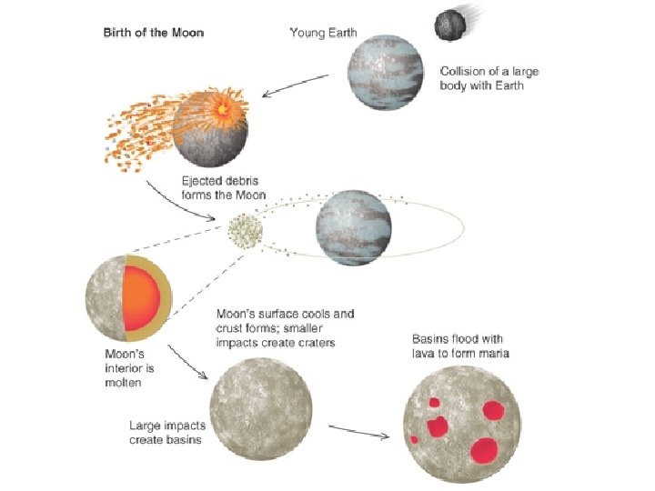 Moon Formation • Early Theories: Capture, Co-formation(twin), broken off from Earth (fission). • Chemistry of Moon rocks show Moon is both like and unlike Earth • Result: Impactor Theory – Moon formed by a giant asteroid striking a glancing blow on the Earth
