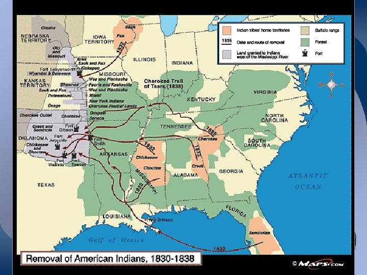 Trail of Tears • Georgia govt. smashes in Cherokee printing press • US troops move 18, 000 Cherokee at gunpoint 800 miles from 18381839 • 25% of Cherokee died most elderly and children