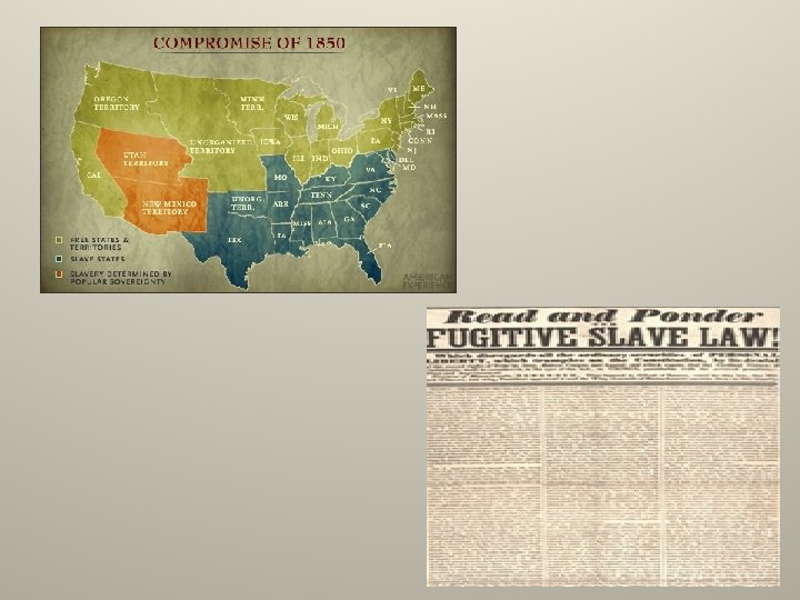 Compromise of 1850 • Henry Clay drafts another plan • California would be admitted as a free state and slave trade abolished in Washington D. C. • Congress would pass no more laws regarding slavery in the new territories from Mexico • Congress would pass laws to help recapture runaway slaves become known as the Fugitive Slave Act.