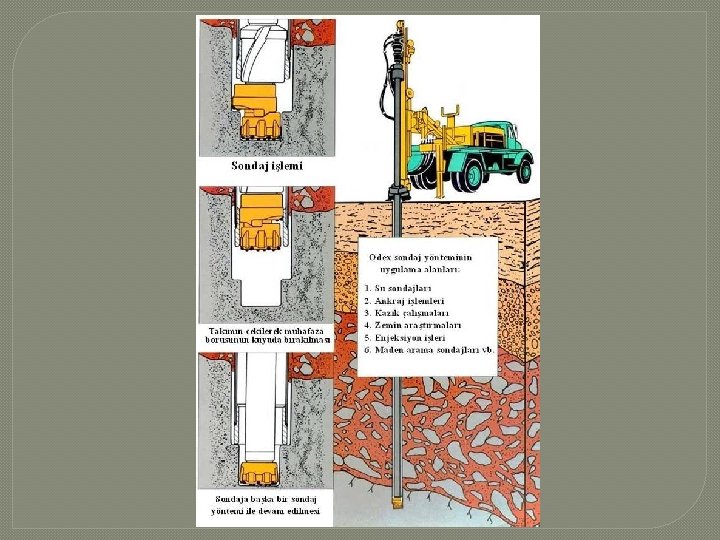 Odex Sondaj Yöntemi �Aşağıdaki durumlardan bir veya birkaçı ile karşılaşıldığında ODEX yöntemi kullanılmalıdır. �- Örtü tabakalarına muhafaza borularının indirilmesi işlemlerinde �- Örtü tabakalarında bloklar mevcutsa �- Zemin kalitesi bozuksa