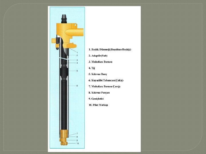 Kuyudibi Tabancası ve Matkabı �Kullanılan matkap çapları genellikle 5 1/8”-5 1/2” (130 -140 mm)’dir. �Çift duvarlı tij çapları, kullanılan matkap çapından 1/2” veya 1” daha küçük olmalıdır.