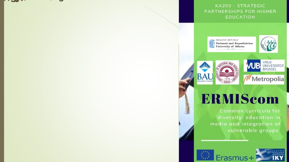 Priorities of ERMIScom project Priority of ERMIScom is to provide: ▪ media students & professionals with a solid education on media ▪ the necessary skills to change the society’s mindset & create an inclusive society through their work in media. ERMIScom opts for: ▪ teaching common contemporary political, economic & social subjects in Europe & the world that need to be highlighted & prioritized ▪ upgrading personal & professional skills, especially in the field of ICT & new media, in the context of a modern study program ▪ teaching methodologies by including innovative teaching practices and nonformal education methods targeting soft skills
