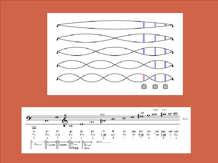 I suoni armonici �Prendendo il DO 1 come riferimento unitario ecco i suoni armonici DO 2 = 2 (frequenza doppia) SOL 2 = 3 (frequenza tripla) DO 3 = 4 MI 3 = 5 SOL 3 = 6 SIb 3 = 7 DO 4 = 8 RE 4 = 9