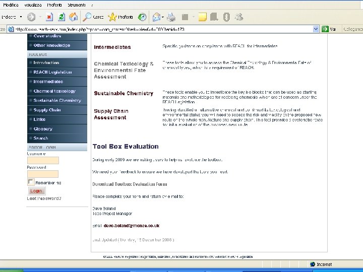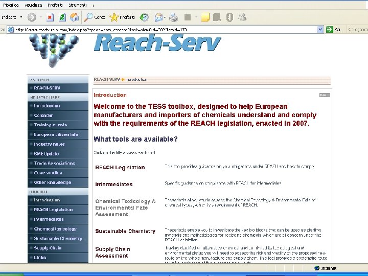Toolbox Come risultato del progetto è stato creato un Toolbox (www. reach-serv. com) disponibile su internet) in Inglese in forma interattiva, è gratuito e di facile accesso per tutte le Imprese Contiene 4 sezioni principali: • Regolamento REACH • Tossicologia e destino ambientale • Chimica sostenibile (data base per le alternative) • Valutazione della catena d’approvvigionamento (metodologia per l’auto-valutazione per la fattibilità dei cambiamenti)