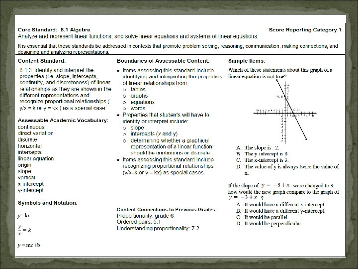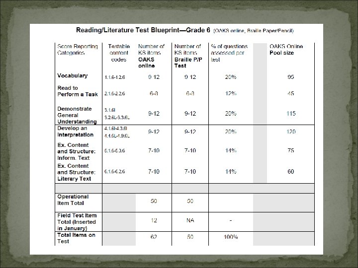 Issues With Clear Solutions �Purpose of the test, item types, psychometric approach to scoring, format �Test Length, Approximate Time Required �Students that are eligible �Achievement level descriptors