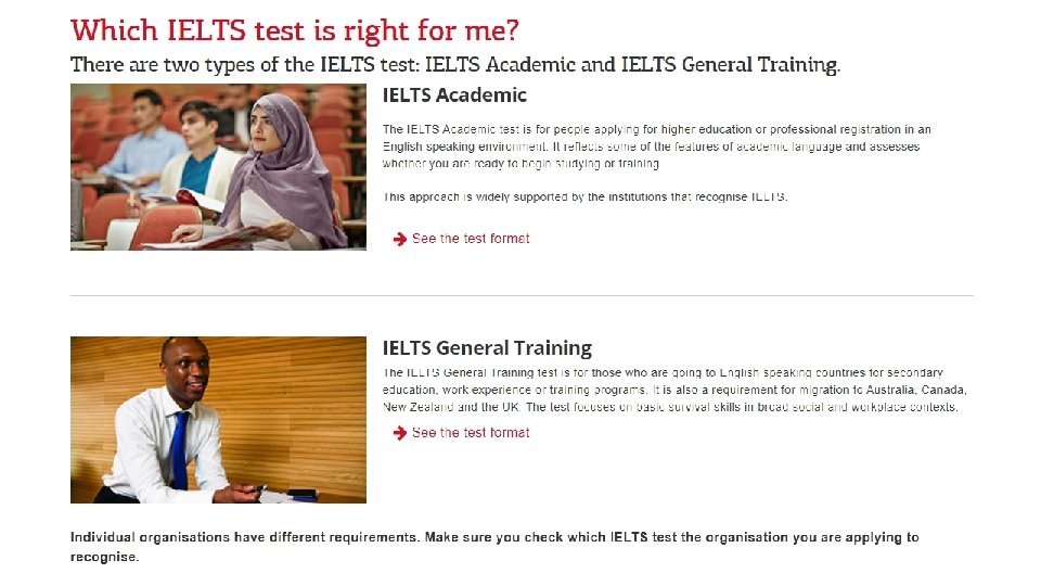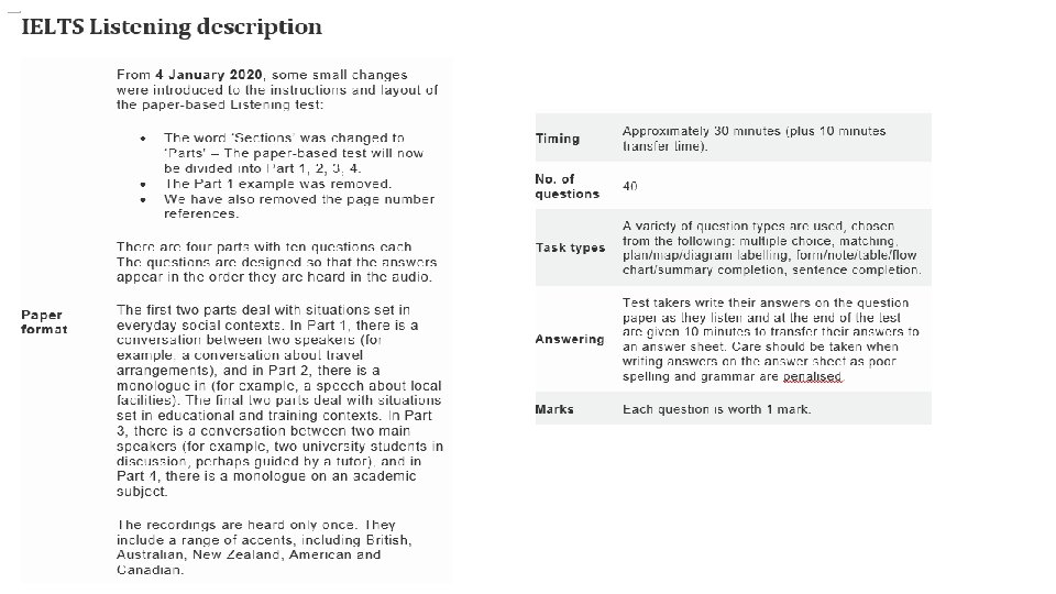 Test format – Listening 30 minutes You will listen to four recordings of native English speakers and then write your answers to a series of questions. Recording 1 – a conversation between two people set in an everyday social context. Recording 2 - a monologue set in an everyday social context, e. g. a speech about local facilities. Recording 3 – a conversation between up to four people set in an educational or training context, e. g. a university tutor and a student discussing an assignment. Recording 4 - a monologue on an academic subject, e. g. a university lecture. Assessors will be looking for evidence of your ability to understand the main ideas and detailed factual information, the opinions and attitudes of speakers, the purpose of an utterance and evidence of your ability to follow the development of ideas.