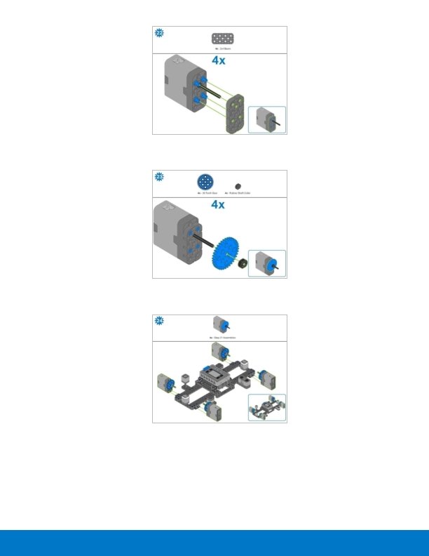 Build Instruction Tips All Steps: There is important information about which parts are needed for the step above the partition line. The number below the image of a part is the number of that part required in the step. There may be dimension information below the part to help identify which size to use. Step 1: Count all pieces before starting your build, including sensors and motors. Step 5 and 13: Flip the build over to add the blue connector pins as shown. Steps 21– 23: These steps show you how to put together a single motor sensor group. You will build 4 of these in total.