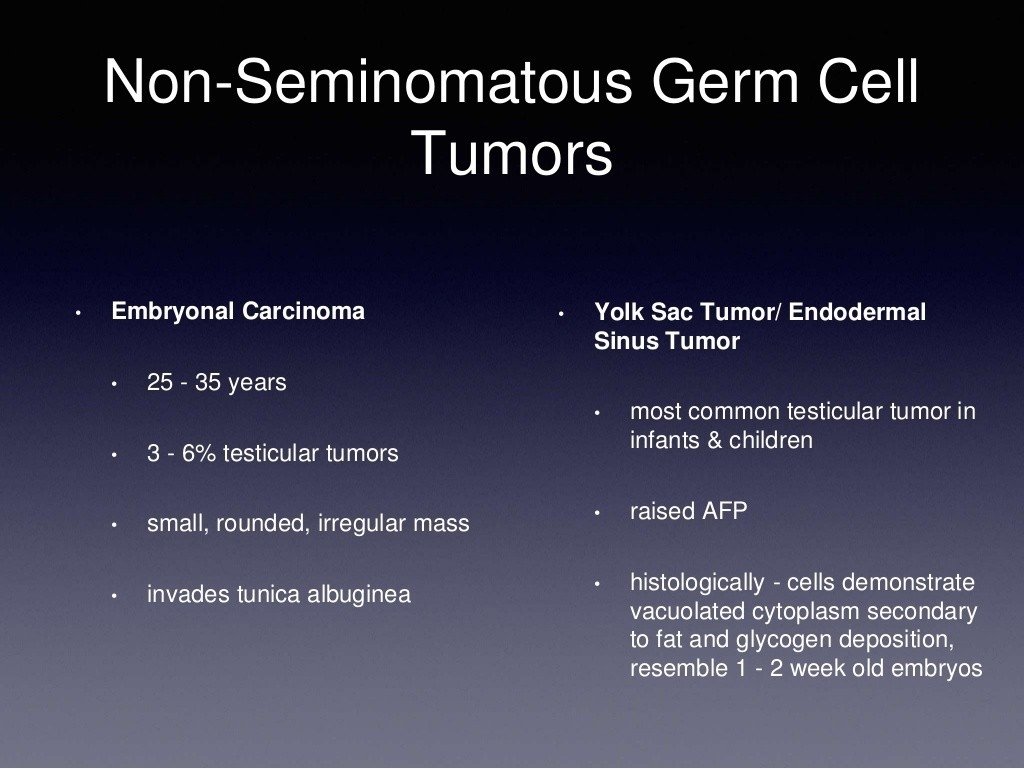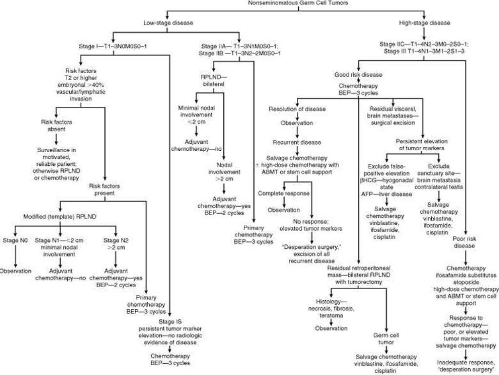 NON-SEMINOMATOUS GERM CELL TUMOR Management of men with NSGCT stage I depends on the presence of factors that present an increased risk of relapse: - Lymphovascular invasion - Predominance of an embryonal carcinoma component - A T 3 or T 4 primary tumor
