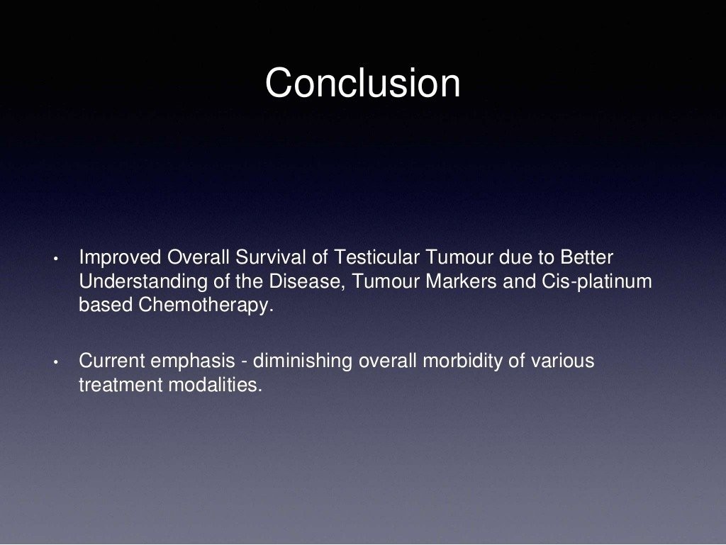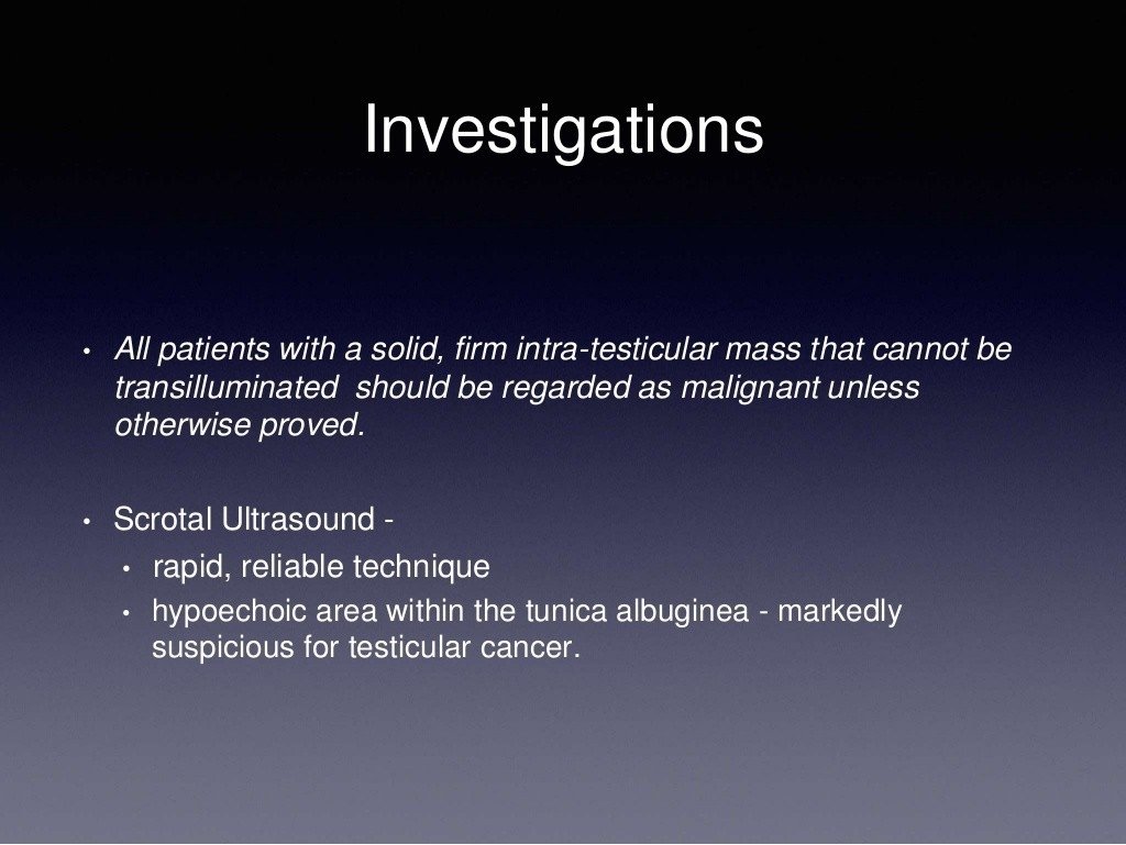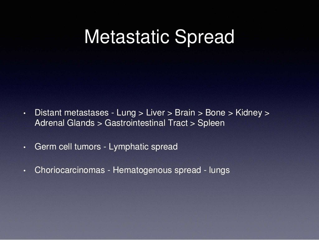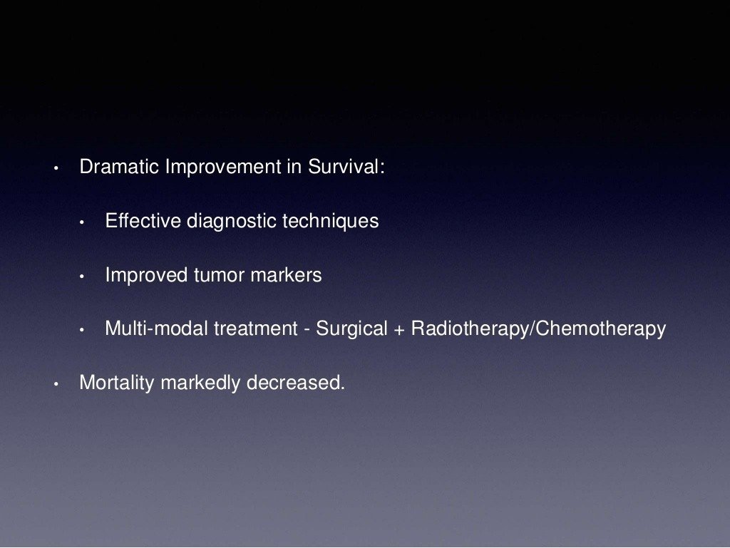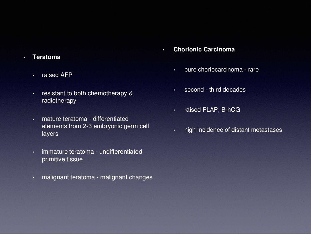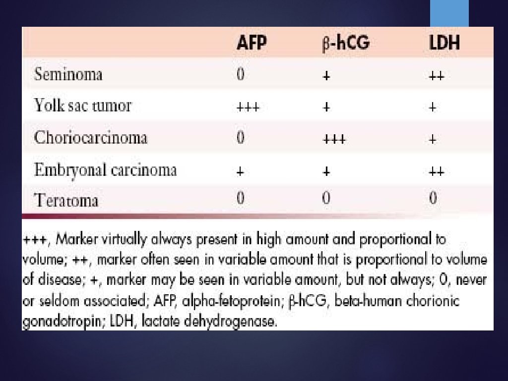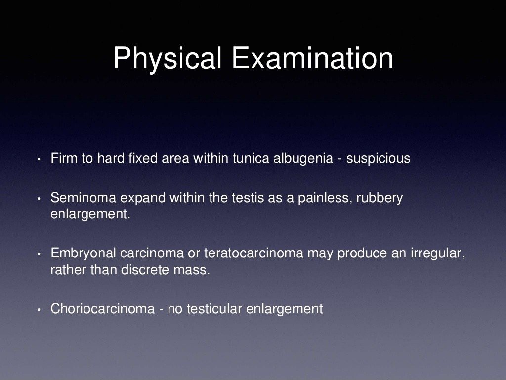 STAGING OF TESTICULAR CANCER • Stage I: tumor confined to the testis • Stage II: spread to regional lymph nodes • IIA: <2 cm in size or < 6 positive nodes • IIB: 2 -5 cm in size or > 6 positive nodes • IIC: large and bulky abdominal mass, usually > 5 -10 cm • Stage III: spread beyond retroperitoneal nodes or above diaphragm or visceral disease • Stage IV: hematogenous spread