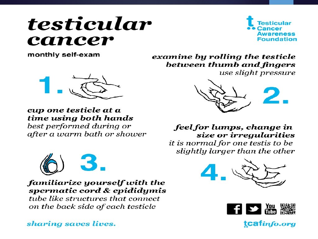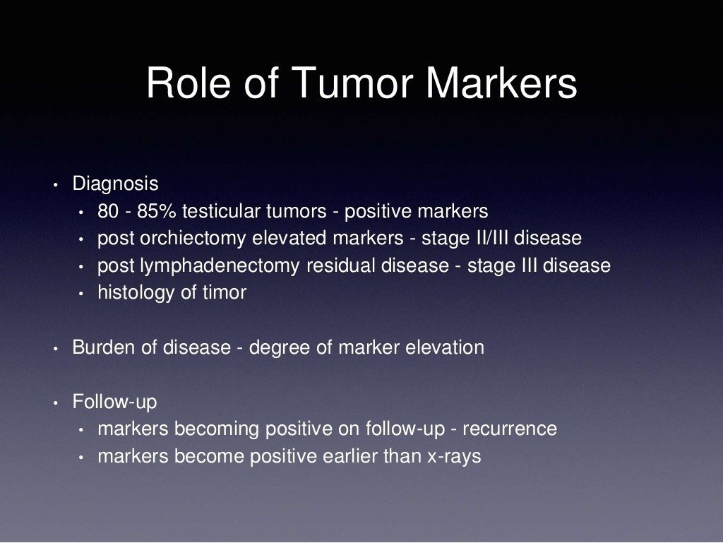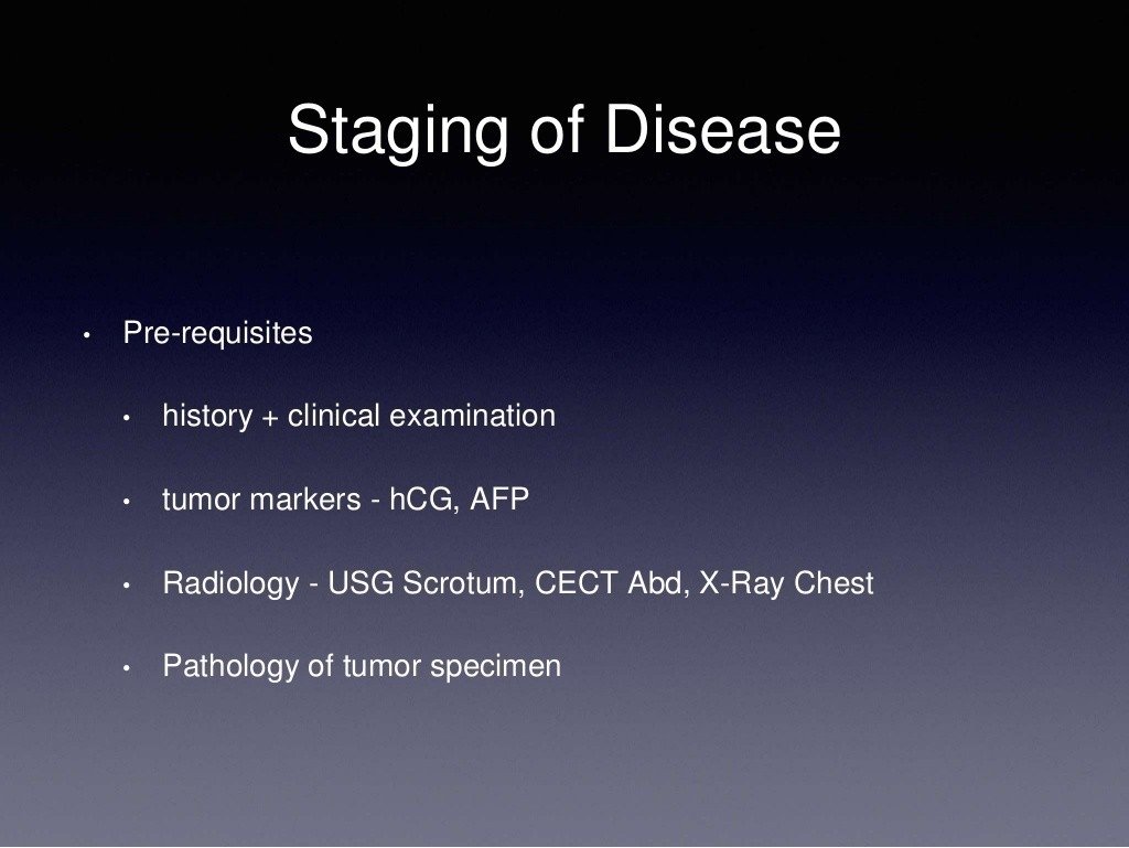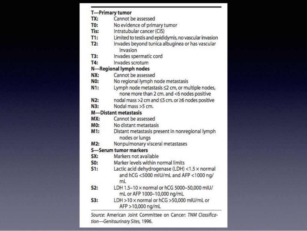 TNM STAGING American Joint Committee on Cancer (AJCC) T the extent of spread of the primary tumor to the tissues next to the testicle N number of lymph nodes affected M metastasis +/S indicates the serum level of tumor markers (specific for certain types of testicular cancers)