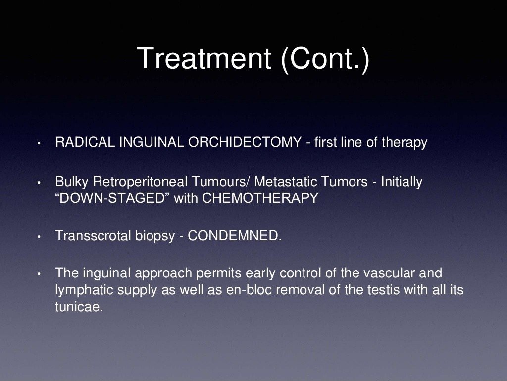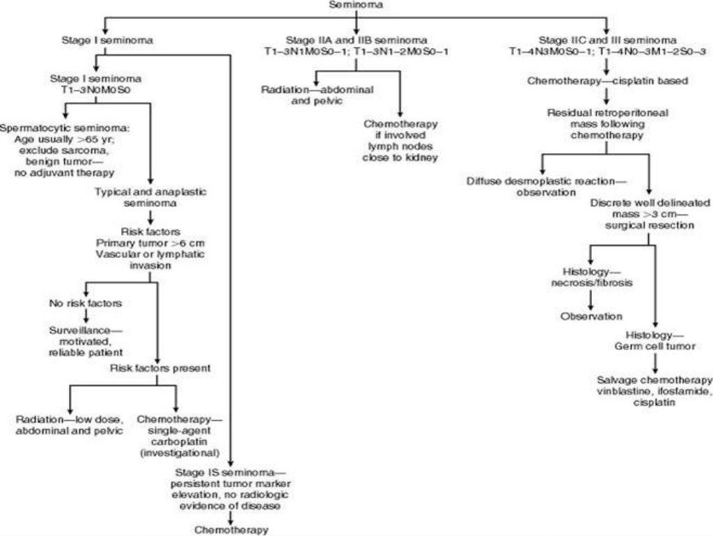 TREATMENT OF SEMINOMAS Low grade (stage I and IIA) Radical inguinal orchiectomy Surveillance RT or single agent carboplatin High grade (stage >IIA) Radical inguinal orchiectomy RPLND RT and/or CT