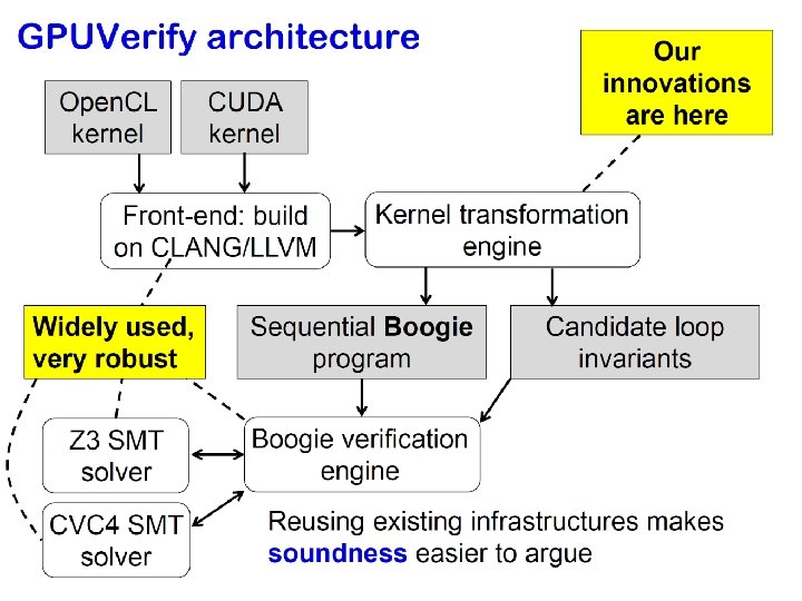 Lesson 2: Reuse infrastructure Open. CL kernel Front-end: built on CLANG/LLVM Widely used, very robust Z 3 SMT solver Our contributions are here CUDA kernel Kernel transformation engine Sequential Boogie program Candidate loop invariants Boogie verification engine Reusing existing infrastructures saved huge effort and made soundness much easier to argue