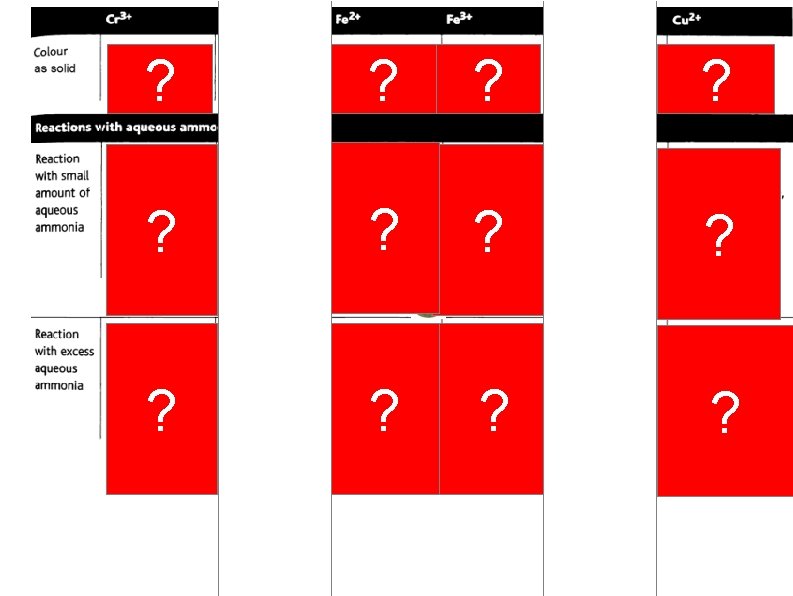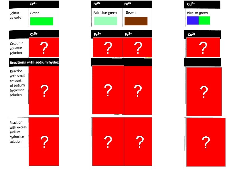 M 3+(aq) + 3 OH-(aq) → M(OH)3(s) aq. ion Na. OH Excess Na. OH NH 3 Chromium (III), soluble in excess Na. OH, insoluble in NH 3 Alumunium (III), soluble in excess Na. OH, insoluble in NH 3