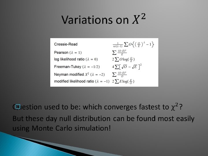 Question today: Which Method has highest Power? function(B=1 e 4) { crit 95<-c(10. 95, 10. 97, 10. 95, 11. 08, 11. 00) E<-rep(1, 6)/6*1000 TS. Sim<-matrix(0, B, 5) for(i in 1: B) { O<table(sample(1: 6, size=1000, replace=T, prob=c(1. 25, 1, 1, 1))) TS. Sim[i, 1]<-sum( (O-E)^2/E) TS. Sim[i, 2]<-2*sum(O*log(O/E)) TS. Sim[i, 3]<-4*sum( (sqrt(O)-sqrt(E))^2) TS. Sim[i, 4]<-sum( (O-E)^2/O) TS. Sim[i, 5]<-2*sum(E*log(E/O)) } power<-rep(0, 5) for(i in 1: 5) power[i]<s sum(TS. Sim[, i]>crit 95[i])/B power }