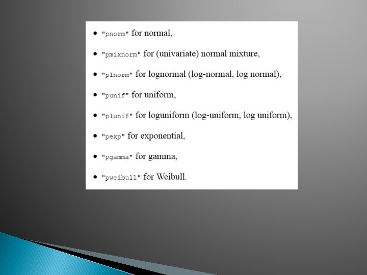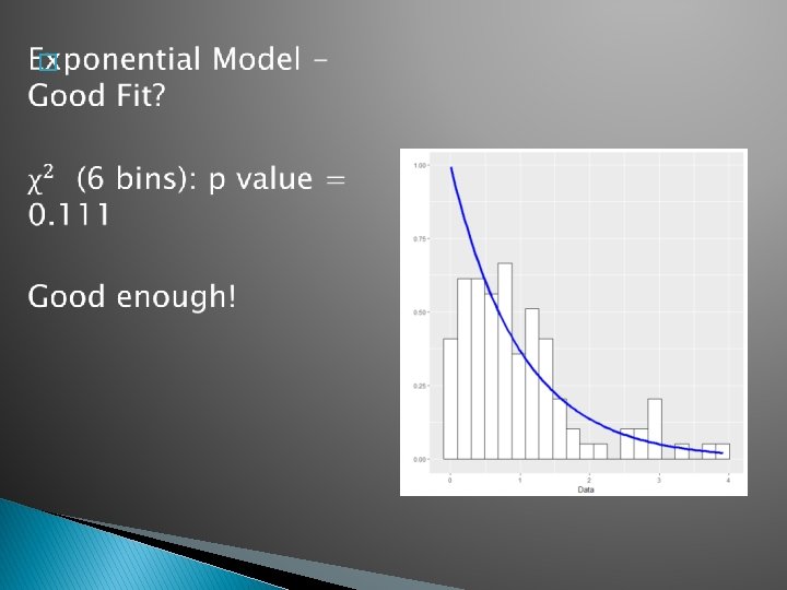 R package KScorrect Uses maximum likelihood to estimate parameters and Monte Carlo simulation to estimate null distribution Example: > x<-rexp(1000, 1) > Lc. KS(x, "pexp")$p. value [1] 0. 3998