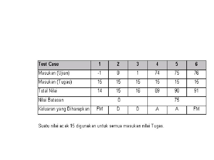 Partisi one-to-one test cases • Test cases untuk partisi masukan “Ujian”, dengan Suatu nilai acak 15 digunakan untuk masukan “Tugas”, adalah sebagai berikut
