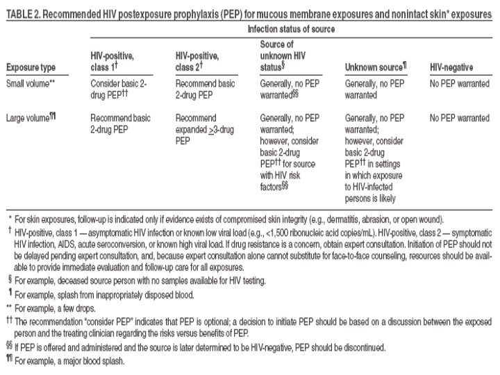 HIV Testing of the Source is Negative • If the source person is HIV negative and has no clinical evidence of AIDS or symptoms of HIV infection, no further testing of the person is indicated. • The likelihood of the source person being in the “window period” of HIV infection in the absence of symptoms of acute retroviral syndrome is extremely small.