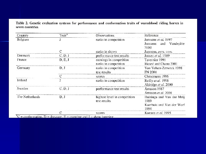Bibliographie n n n Koenen E. P. C. and Aldridge L. I. , Testing and genetic evaluation of sport horses in an international perspective, paper presented at 7 th World Congress Apllied t livestock Production, Montpellier, Augustus 2002 http: //www. wbfsh. org http: //www. ueln. net http: //www. facmv. ulg. ac. be/cours/genquant/05012004 gr 3. ppt http: //perso. orange. fr/pegase. mayenne/testd. htm