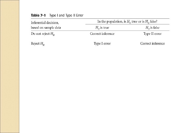 In inferring from a sample to a population, we can be wrong in either of two ways. False rejection error. Falsely rejecting a true null hypothesis. This type of error is usually called Type I Error. Here the researcher concludes there is a relationship in the population, when there is actually none. False acceptance error. Falsely accepting a false null hypothesis. This type of error is usually called Type II Error. Here the researcher concludes there is no relationship in the population, when there actually is one. Which type of error is worse (if you don’t want to mislead science)? Type I error is worse. Why? Consider the following graph as a way of organizing your thoughts on Type I and II error.