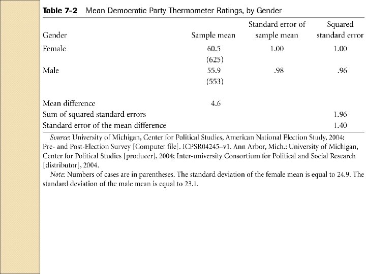 Comparing the Means of Two Groups Consider the variables from the National Election Studies which give respondents’ feeling thermometer about the Democratic party. Men and women differ in their feelings about the Democratic party. However, in order to test the significance of these differences we need the standard error of the mean differences. If the variances of the two samples are the same, then we can simply calculate these from the standard errors for men and women. Square the two estimates of the standard error for the two samples for men and women. Sum the squared standard errors. Take the square root of the sum of the squared standard errors. That is,