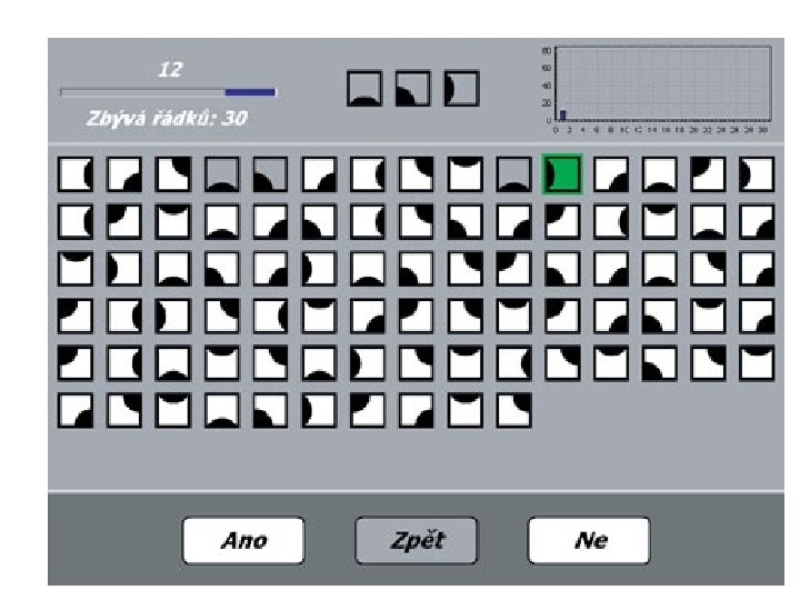 Test diskriminace tvarů • Švancara, 1976; normy pro 9 - 18 let • Autor metodu charakterizuje jako výkonový test (navazuje na obdobné metody jako Bourdonův škrtací test). • 1250 obrázkových podnětů po 50 ve 25 řádcích, tvary 5 typů v různé poloze. • Dítě má přeškrtat všechny obrázky jednoho určitého typu, práce je časově limitovaná. • Získáme informace o úrovni rychlosti a přesnosti zrakové percepce. Křivka výkonu. • Diagnostika poruch pozornosti, poruch zrakové percepce, dif. dg. specifických poruch učení. • Individuální administrace.
