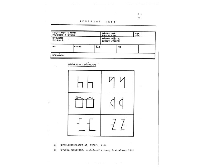 Rekogniční test reverzní tendence • Zápotočná, 1990, normy pro děti 5, 5 – 8, 5 let. • Metoda je reakcí na nedostatky Edfeldtova reverzního testu. • Využívá mechanismus znovupoznání – tendence k reverzím vzniká jako důsledek zhoršené schopnosti rozlišovat pravolevou orientaci znaků při jejich znovupoznávání. • Problém dle autorky není v percepci, ale v paměti. • 15 úkolů, 1 zácvičný; každá položka=jedna předloha prezentace 3 vteřiny, rekognice 2 obrazce identické a 10 odlišných. • Individuálně i skupinově. • Při vyšetření školně nezralých dětí, při dif. dg. specifických poruch učení a dětí s organickým postižením CNS.