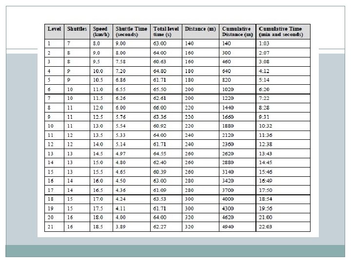 YOYO INTERMITENT RECOVERY TEST (BANGSBO) � Nazýván podle autora, profesora fyziologie Jense Bangsba � Test má dvě úrovně (mládež a amatéři, profesionálové) � Test vytrvalostních schopností a předpokladů pro pohybový výkon v utkání � Zvuk nahrán na originální audiokazetě � Člunkový běh se stupňovanou rychlostí do maxima � 20 m vzdálenost, na konci se otáčí a na signál běží zpět � Po určitém počtu úseků se zvyšuje rychlost běhu � Počítá se počet uběhnutých úseků � Dovoleno jednou doběhnout po limitu � https: //www. youtube. com/watch? v=nk. Ok_P 5 Vn. OA