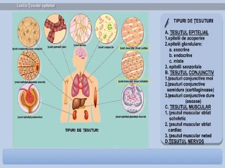1. Tesutul epitelial — este format din celule de diferite forme Clasificare: epitelii de acoperire epitelii glandulare epitelii senzoriale inapoi la clasificare