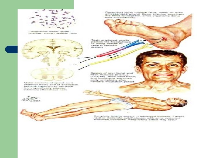 l l l l PATOFİZYOLOJİ: Gram+ hareketli, kapsülsüz, anaerobik bir bakteri olan clostridium tetani ile oluşan ve genellikle ölümcül bir hastalıktır. Vejatatif yada sporlu olabilir. Sporlar toprakta ve hayvan dışkısında herzaman bulunabilir, oldukça dayanıklıdır ve çevresel yüzeylerde yıllarca hayatta kalabilir. Kontamine eroinde bulanabilir. Ezik ve ölü doku, yabancı cisim ya da enfeksiyon gelişmesi gibi faktörler C. tetaninin toksin üreten vejatatif forma dönüşmesine yardımcı olur. Tetanolizin ve Tetanospzmin adlı iki ekzotoksin üretir. Tetanospzmin hematojen yolla periferik sinirlere yayılır ve retrograd intranöral taşınımla sinir sistemine ulaşır. Glisin ve Gaba salınımını engeller sinir sisteminin normal inhibitör kontrolünü bozar. Tetanozun tüm klinik bulguları tetanospzmine sekonderdir.
