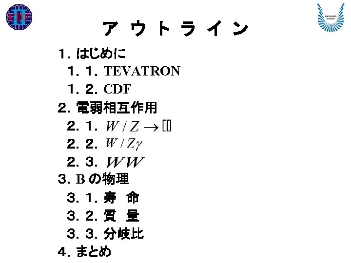 1.はじめに 1.1.Tevatron CDF Tevatron Main Injector + Recycler Main Injector D 0 反陽子生成率の向上 ビーム強度の増加 Recycler 反陽子の再利用 今後 Run IIa 2001年3月より稼動 6× 6@900 Ge. V ⇒ 36× 36@980 Ge. V 5. 2× 1031 cm-2 sec-1 2003年8月11日 (4. 1× 1031 cm-2 sec-1 2003年3月 春の学会) (1. 6 × 1031 cm-2 sec-1 Run 1 b) 300 pb-1 Delivered 250 pb-1 On Tape 130 pb-1 Analysis